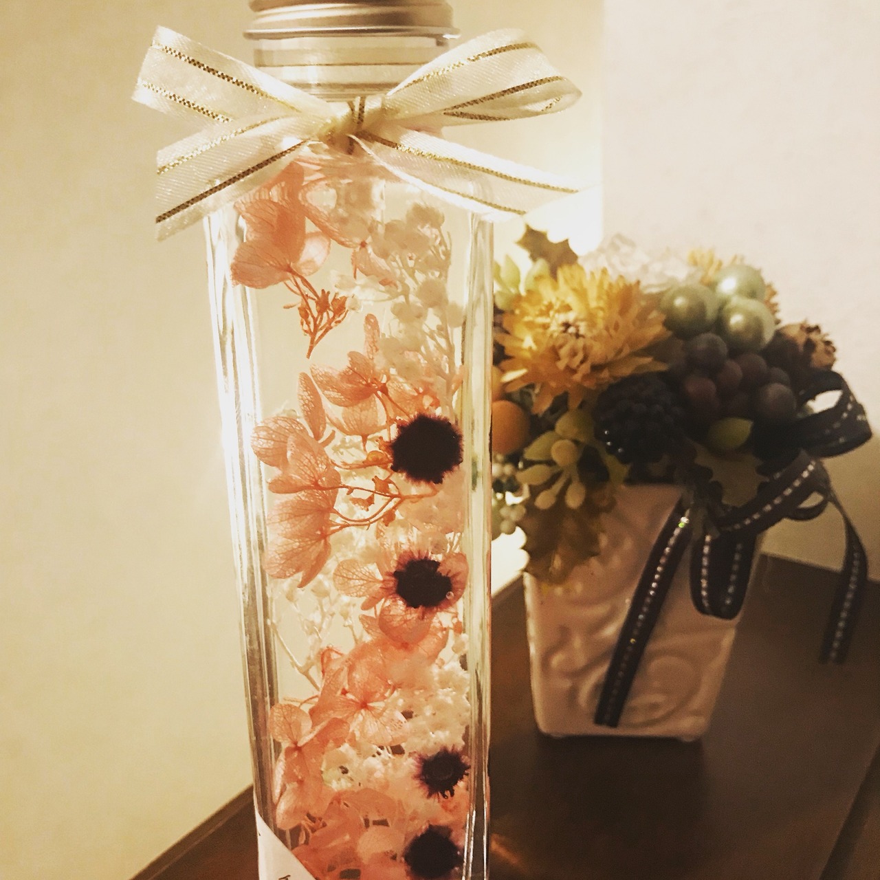 (お花をお好きな位置にガラスを動かして移動させるのもハーバリウムの1つの楽しみなので、自分だけのオリジナルのハーバリウムを作ってみてください。)