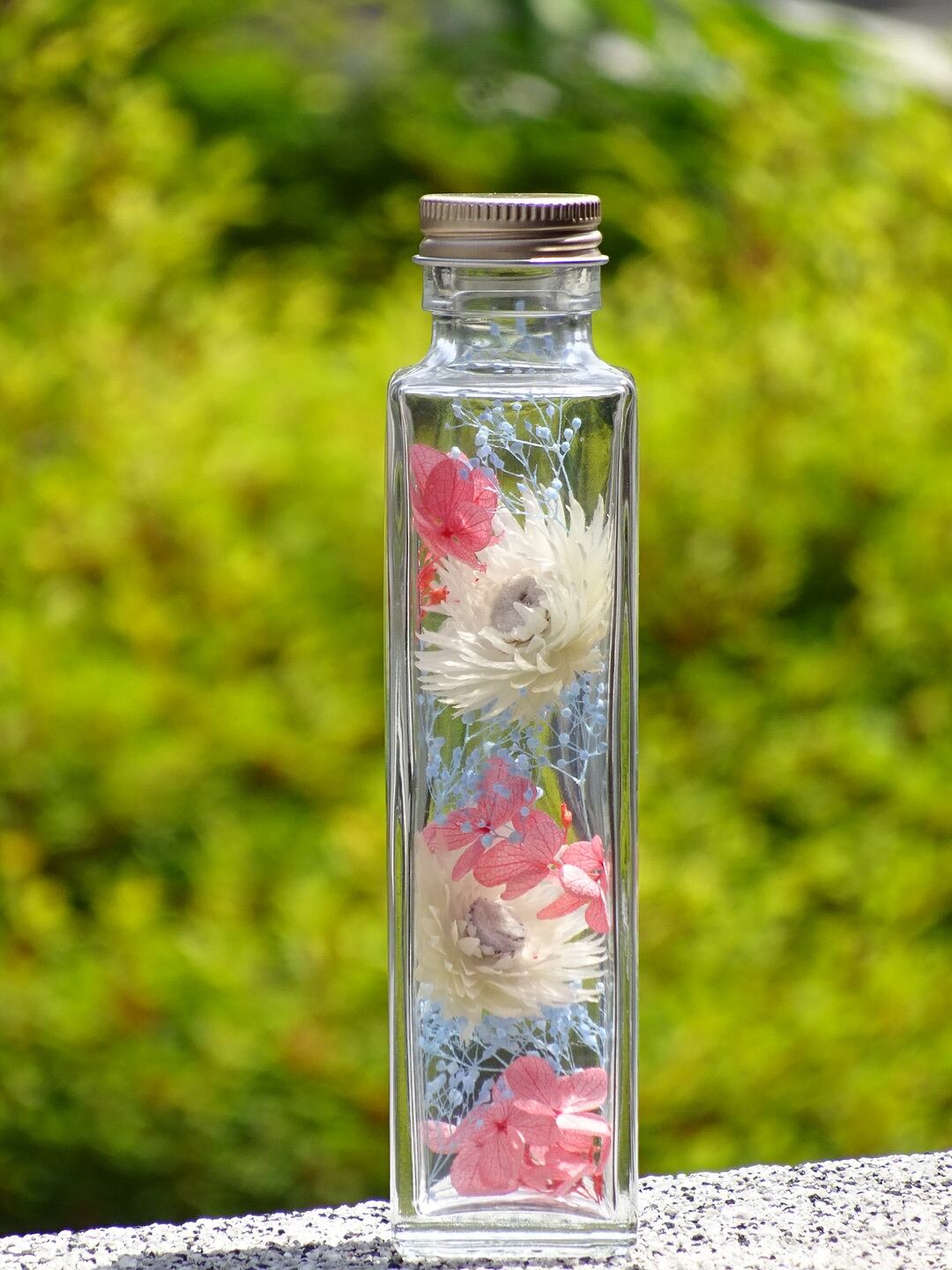 (お花をお好きな位置にガラスを動かして移動させるのもハーバリウムの1つの楽しみなので、自分だけのオリジナルのハーバリウムを作ってみてください。)
